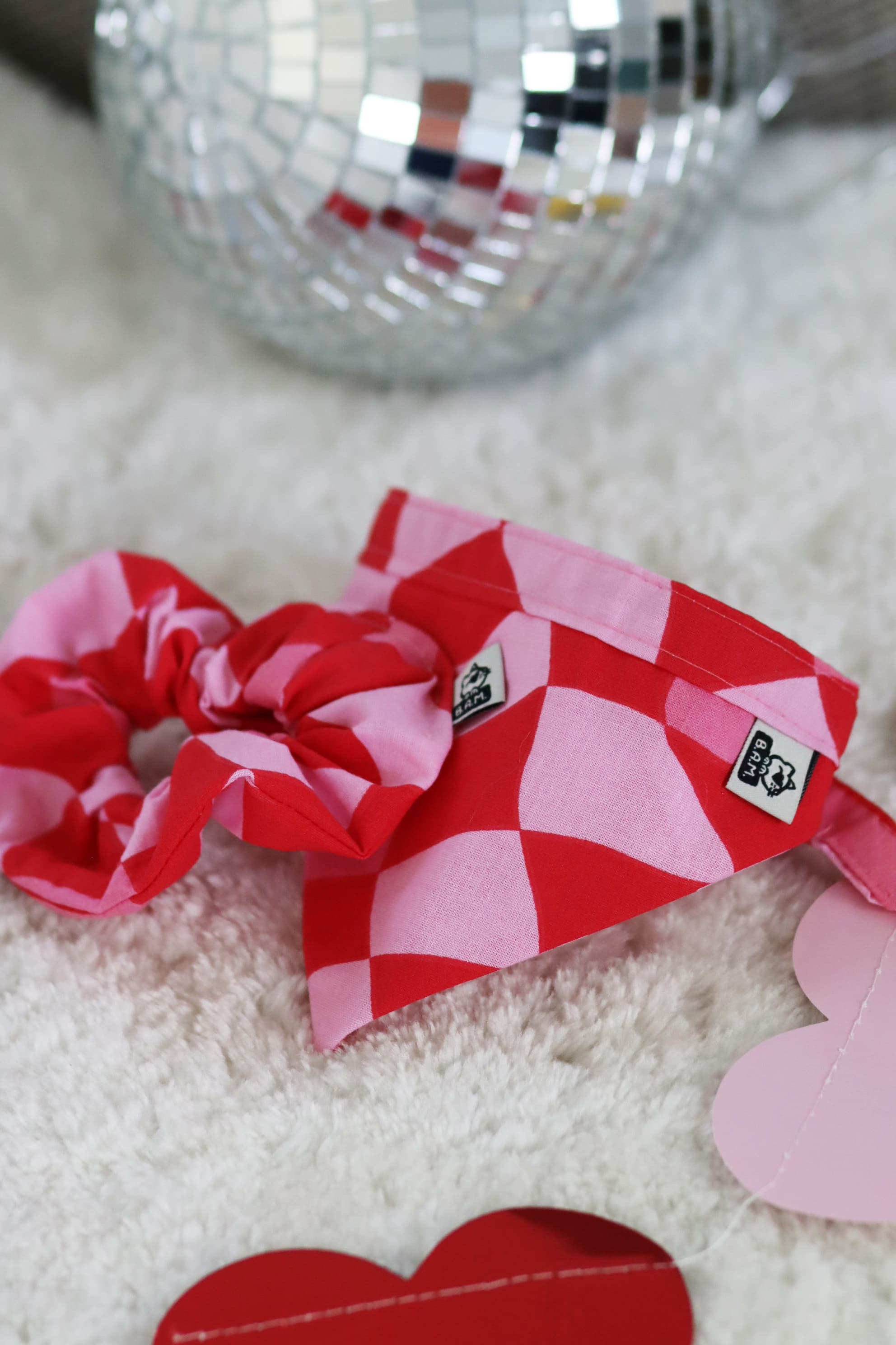 Design tendre et moderne avec motif graphique rose foncé et rose clair. Confortable et facile à attacher. Tailles : XS 18cm | S 23cm | M 31cm | L 41cm. Chouchou assorti disponible.