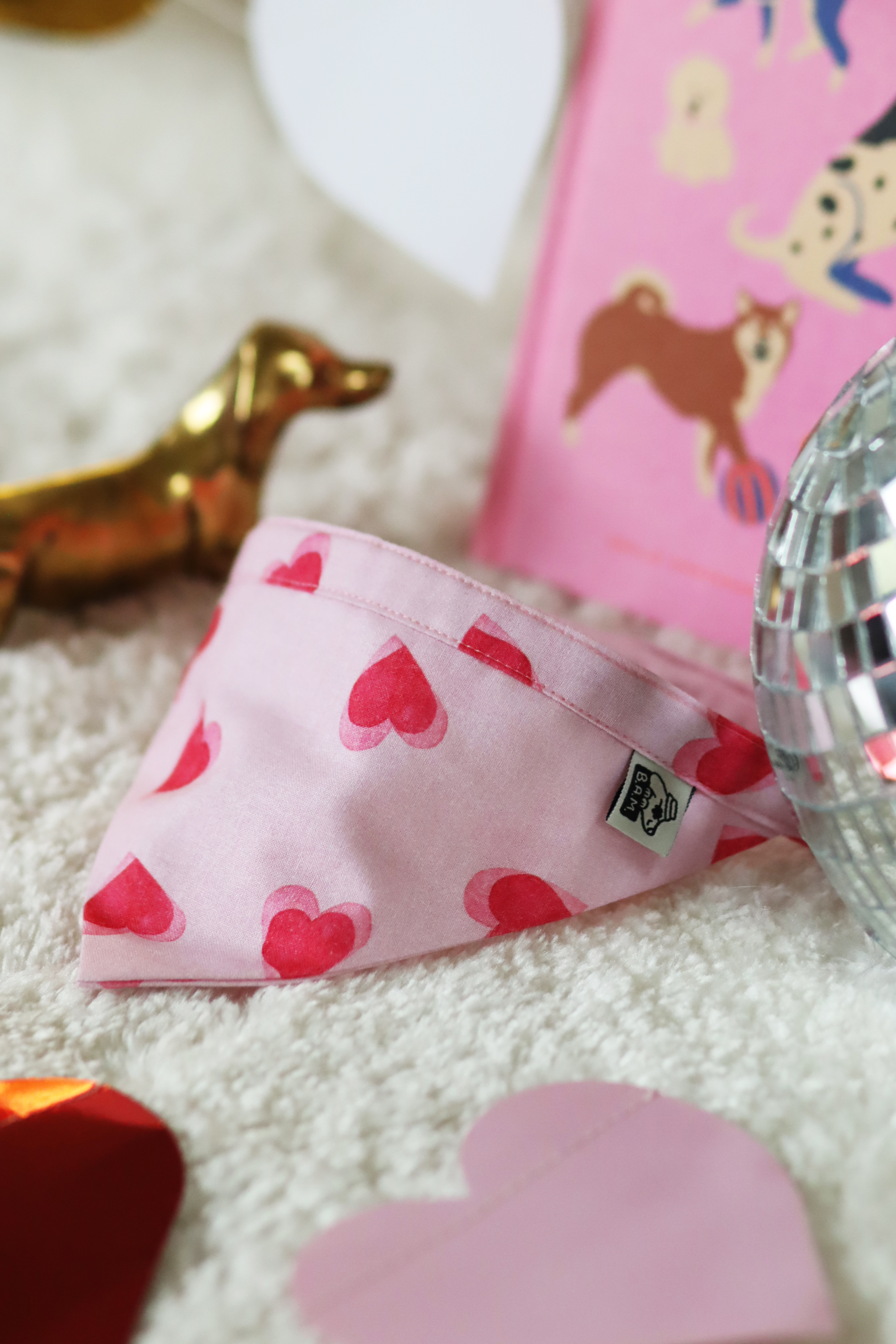 Bandana rose à motif cœurs rose foncé. Confortable et facile à attacher. Chouchou assorti disponible pour le duo parfait.