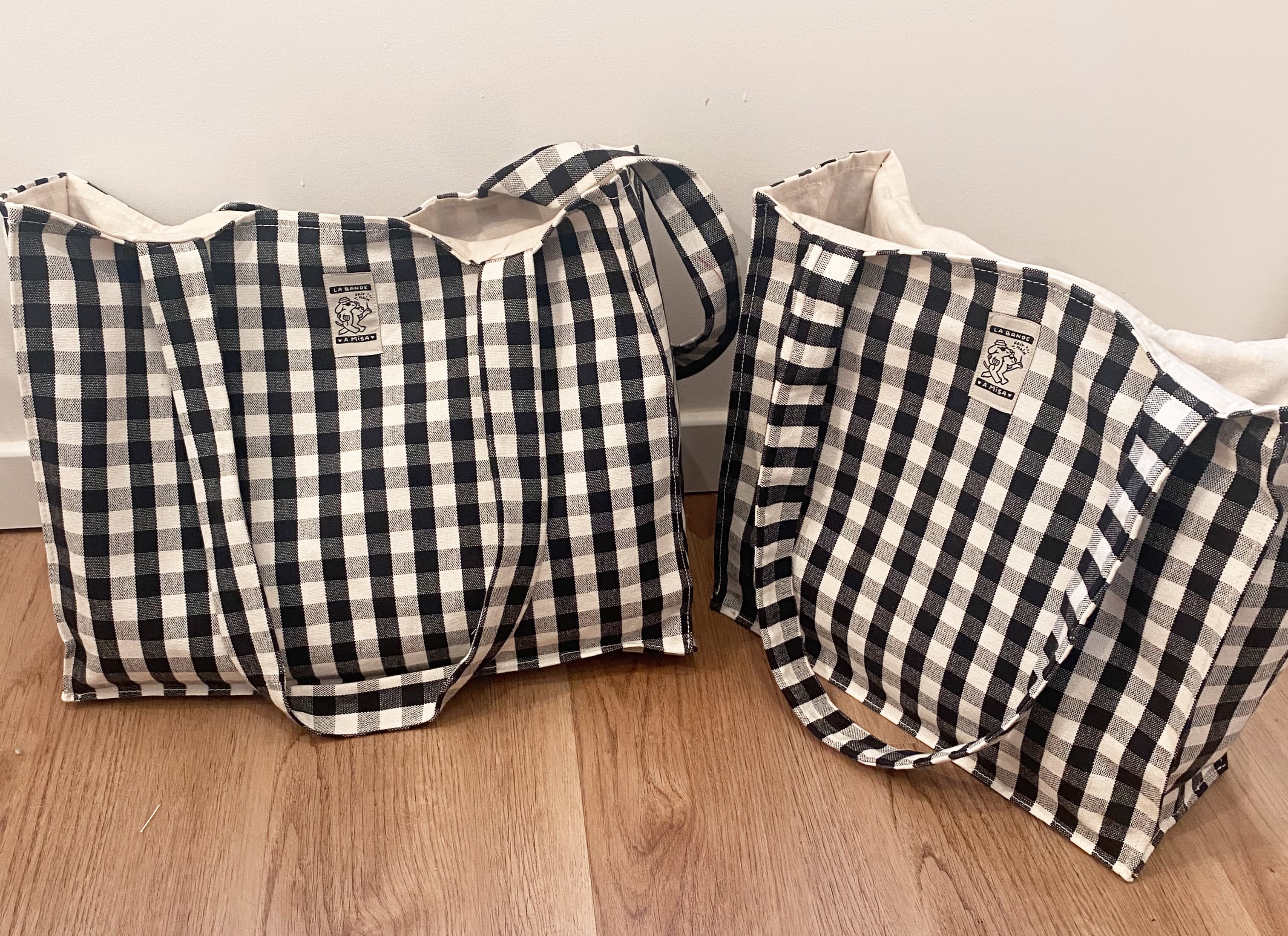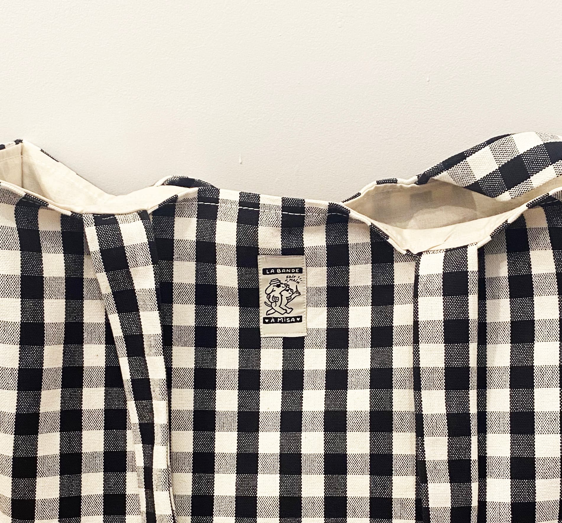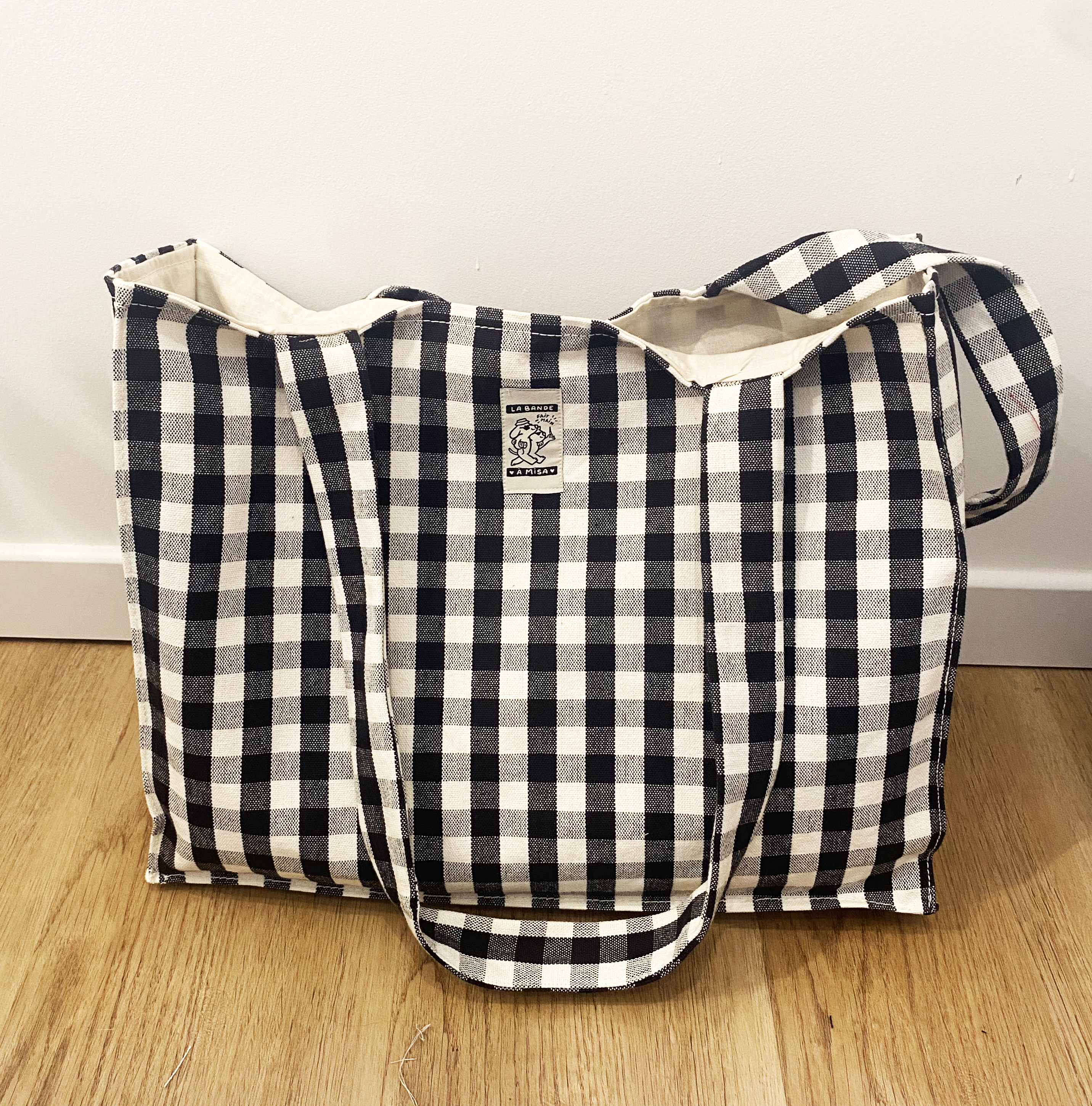 Cabas en toile vichy noir et crème, doublé avec 1 poche pratique. Se porte à la main ou à l'épaule. Une trousse assortie disponible sur demande.